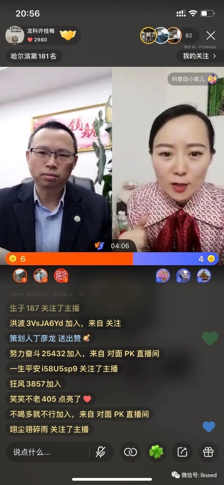 3月1日晚間8點,黑龍江省龍科種業(yè)集團有限公司總經(jīng)理譚春平做客快手平臺直播間,通過線上直播的形式,分析2020年我省備春耕農(nóng)業(yè)生產(chǎn)形勢、種業(yè)市場的供求趨勢,現(xiàn)場解答觀眾提問,推薦優(yōu)質農(nóng)作物品種和種植技術。譚春平總經(jīng)理認為:疫情之下,大家對今年我省農(nóng)業(yè)生產(chǎn)要堅定信心,不要焦躁,更不要悲觀。雖然抗擊疫情形勢嚴峻,但我們積極響應中央、省政府號召,在省農(nóng)投集團黨委的統(tǒng)一部署下,做好充分準備,為全省廣大農(nóng)戶準備了充足的生產(chǎn)用種。目前,龍科種業(yè)全體員工正加緊生產(chǎn),積極調(diào)運,全力保證各地的大豆、水稻、玉米的種子供應。為保證2020年我省糧食生產(chǎn)再奪豐收,保障國家糧食安全貢獻力量!同時,也建議要將這次疫情作為調(diào)整農(nóng)業(yè)種植結構、生產(chǎn)方式、經(jīng)營模式一次轉型升級的機遇。積極轉變思維、開拓新模式,各種子企業(yè)要好內(nèi)功,快速向移動互聯(lián)思維模式轉型。積極開拓種子的線上銷售渠道,利用微信、直播等形式創(chuàng)新營銷模式,為我省農(nóng)業(yè)生產(chǎn)提供種子保障。龍科種業(yè)此次大講堂活動,就是要讓經(jīng)銷商、廣大農(nóng)民對公司、對農(nóng)業(yè)充滿信心。隨后連線黑龍江廣播電視臺——公共?農(nóng)業(yè)頻道主持人田妮的直播間,為田妮直播間的觀眾解讀、分析國家農(nóng)業(yè)政策。此次直播吸引大量人員在線觀看,積極參與現(xiàn)場公屏互動,場面十分火爆、熱烈。